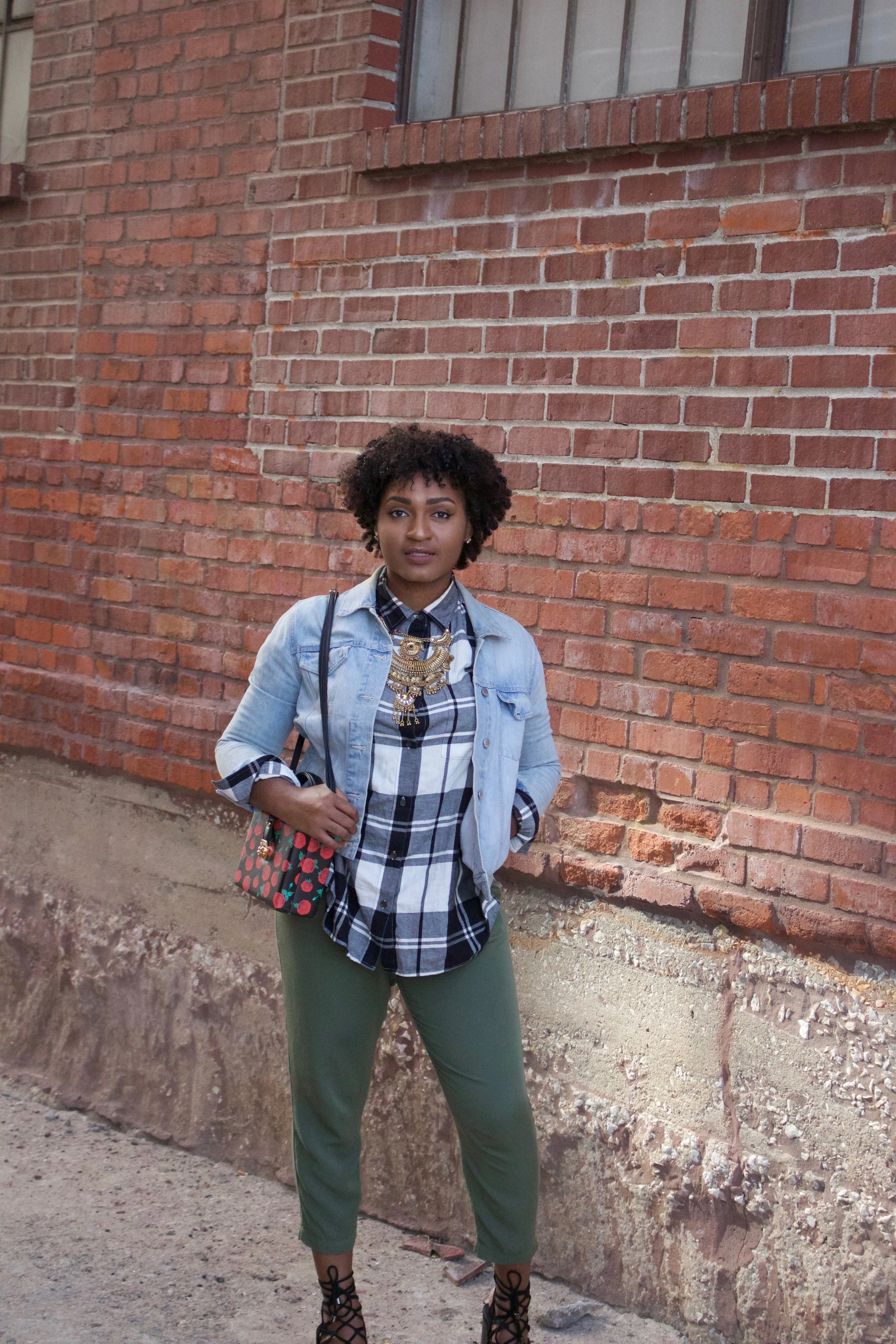 This bag and strappy heels take this look from basic to chic, quickly might I add. Statement pieces help to dress up this basic plaid top. If you're ever bored with your plaid, throw on a fun lip color and add some bling to your collar. You can never go wrong with a statement necklace or stand out bag.